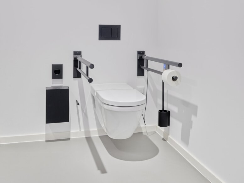 L’équipement homogène avec les produits des systèmes 900 et 162 de HEWI, associé à leur teinte foncée et à d’autres éléments d’aménagement tels que les robinetteries, devient un élément de conception marquant dans les espaces sanitaires.